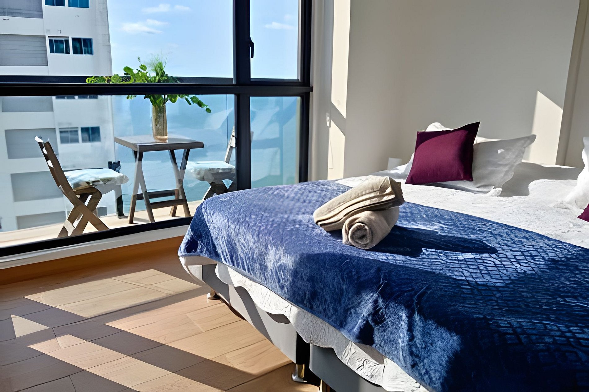 Discover tranquility and luxury at our 2bedroom, 2bathroom apartment boasting breathtaking views of the city and just steps away from both the beach (50 meters) and the historic walled city of Cartagena (4 Blocks). Located in a safe and serene neighborhood, enjoy first-class amenities including a stunning 180-degree view pool, fully equipped gym, coworking space, and wet areas. Ideal for those seeking comfort, security, and unparalleled views